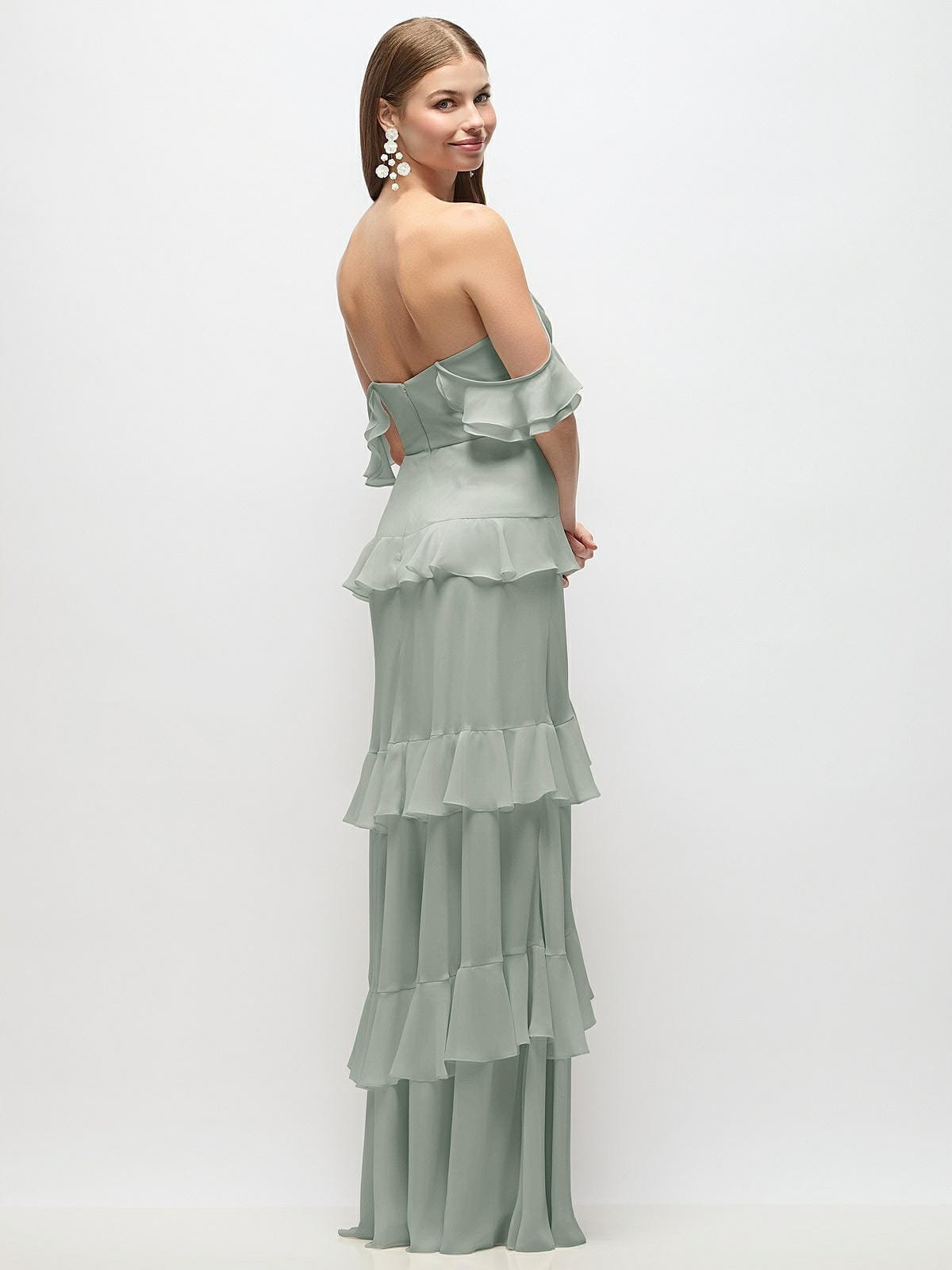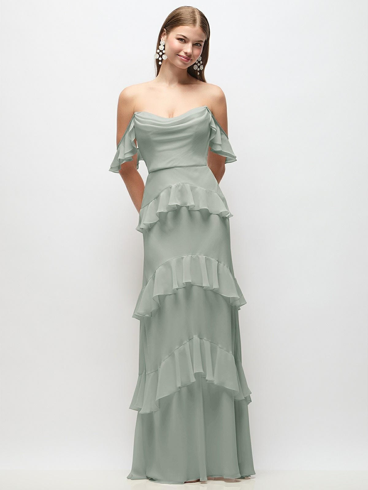 Full length Lux Chiffon Print dress with draped cowl bodice and ruffle bias skirt. Convertible off-shoulder ruffle straps.