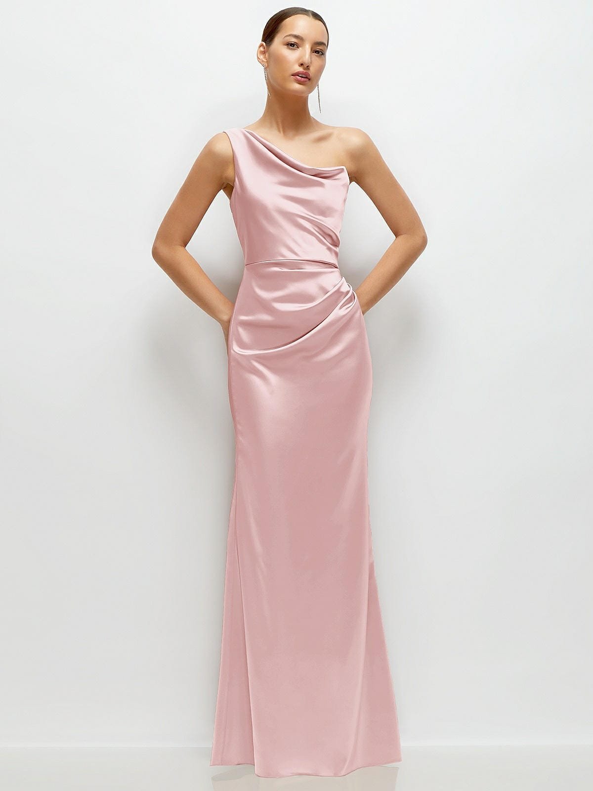 This stunning satin maxi dress channels some serious goddess energy with its effortlessly chic one-shoulder neckline that's all about those soft, sculpted lines. The asymmetrical pleated cat-eye cowl detail adds a pop of drama, draping perfectly for that laid-back elegance. Crafted in smooth, neu stretch charmeuse, the dress hugs your curves with a fit-and-flare silhouette—while gentle drapes gather at the side, giving it a captivating, fluid movement. It's the kind of dress that feels both classic and fresh, ready to turn every step into a moment.