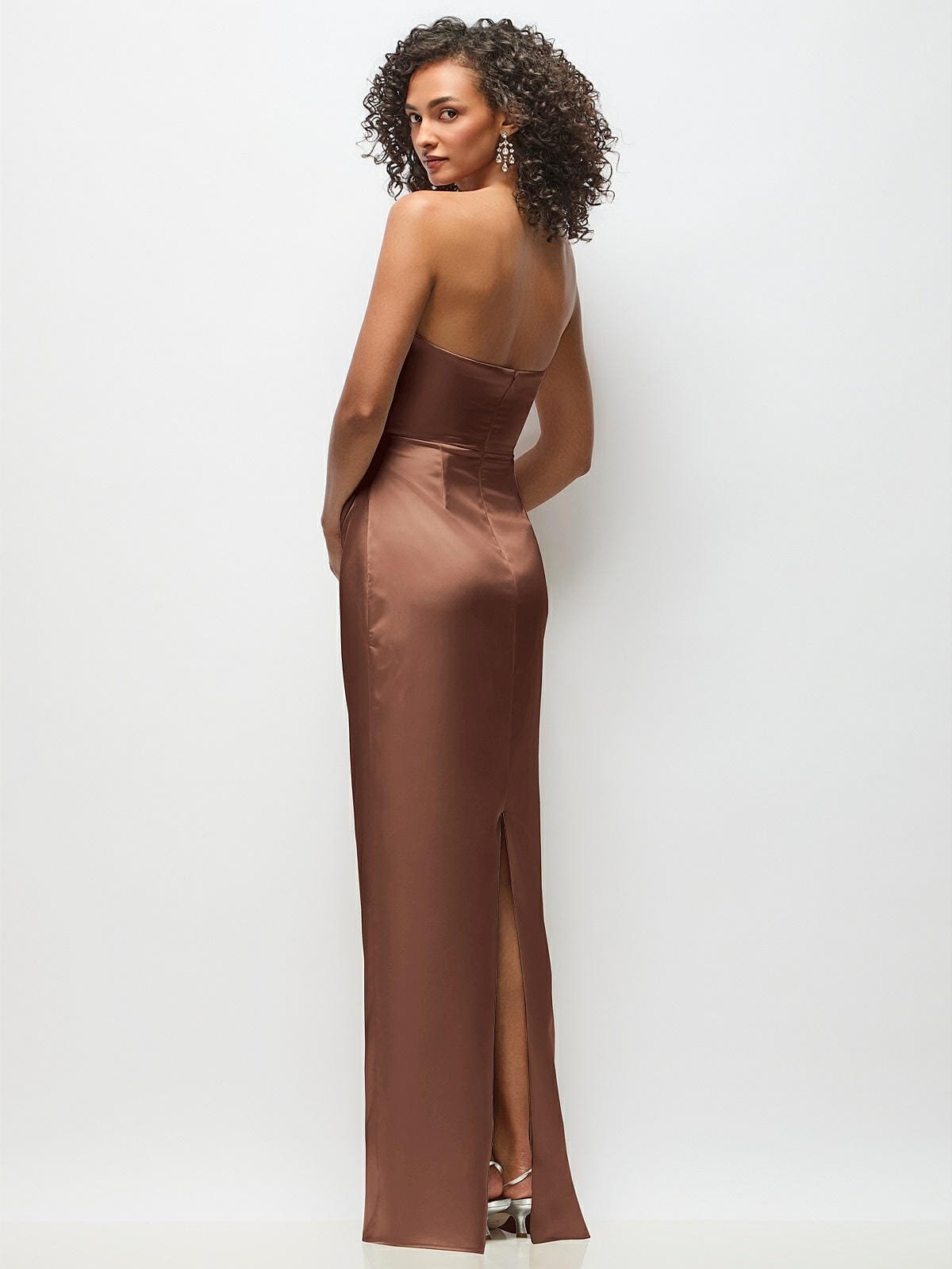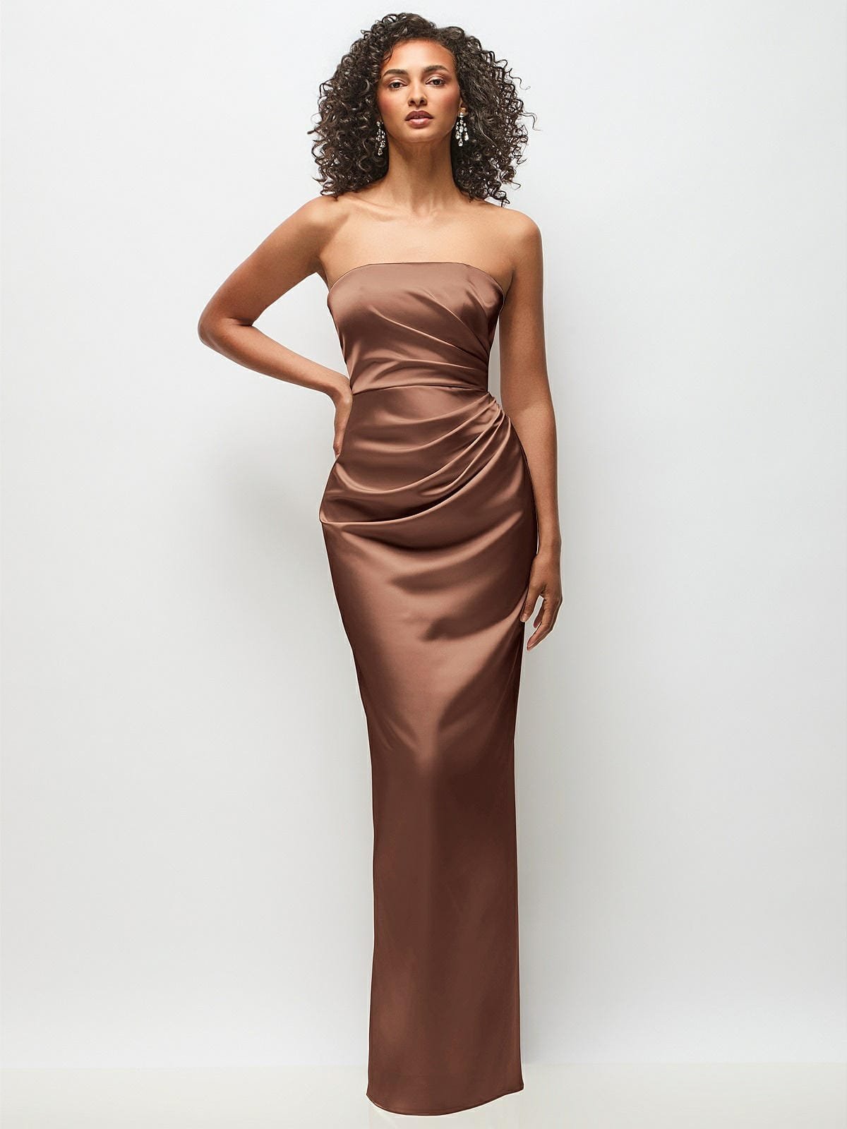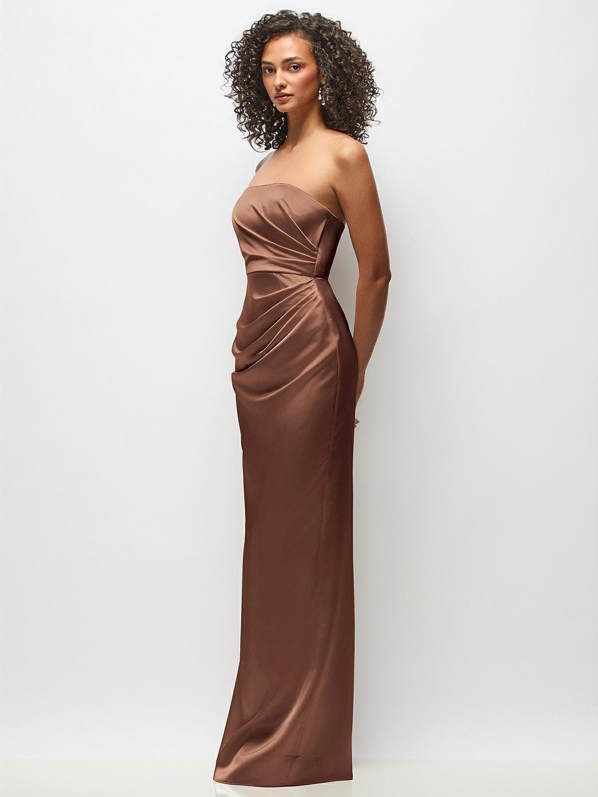 Full length strapless Neu Stretch Charmeuse dress with draped bodice and column skirt.