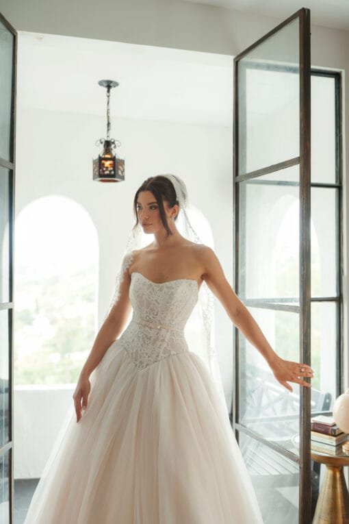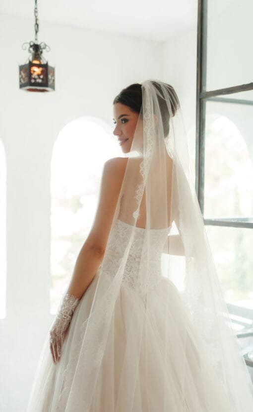 For a refined take on fairytale elegance, Style SY8189 pairs timeless design with charming detail. The strapless cat eye bodice is crafted in intricate allover lace, showcasing delicate texture and artistry from every angle. At the waist, a dainty detachable bow wraps gracefully, adding a touch of softness and romance. A classic basque waistline transitions into a full gathered tulle skirt, creating the iconic ballgown silhouette with lightweight volume and movement. Blending traditional elements with a sweet, modern accent, this gown is designed for a truly memorable walk down the aisle.