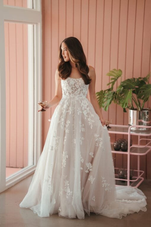 A modern romantic vision, Style SY8213 is crafted for the bride who loves delicate detail and soft colour. This wedding dress features a sweetheart neckline with a sheer tulle bodice richly covered in lace appliqués that gently cascade down the frothy skirt. The fitted bodice highlights intricate floral patterns, creating a textured look. From the waist, layers of lightweight tulle flow into a soft A-line silhouette, offering graceful movement and a subtle blush glow. Designed for understated elegance with a hint of whimsy, this gown is perfect for a bride seeking a refined yet enchanting style.