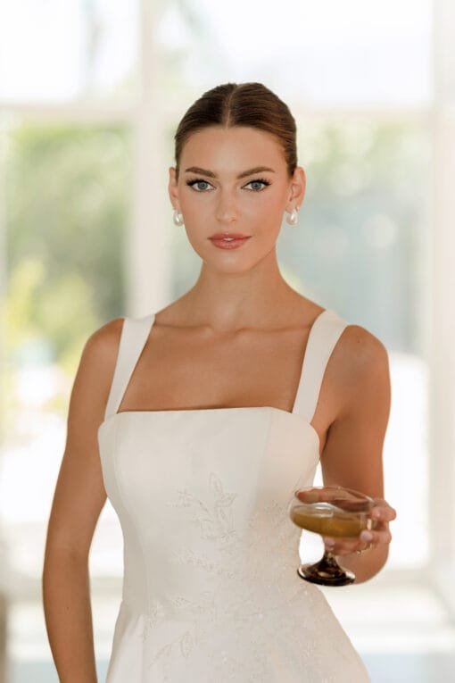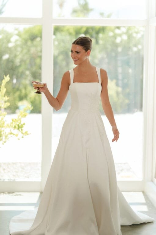 Style SY8217 combines classic glamour with contemporary elegance for a striking bridal look. The bodice showcases a straight-across neckline complemented by thick detachable straps that form a modern square neckline. Delicate stitched floral patterns subtly embellish the bodice, continuing around the back and cascading softly onto the skirt, adding graceful movement and texture. Structured boning ensures a comfortable flattering fit, while the gently scooped back creates a stunning shape. The A-line skirt expands into a dramatic, voluminous train, finished with a line of fabric-covered buttons for refined detail.